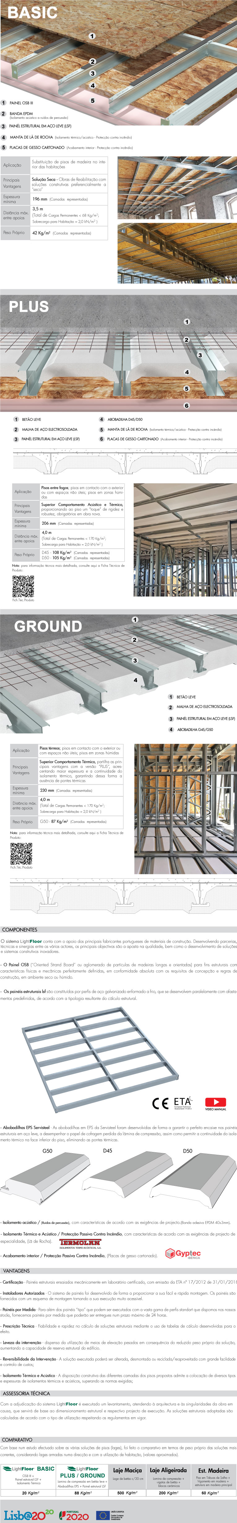| Nas obras de reabilitação/Nova, o uso de pisos aligeirados representa grandes vantagens quer ao nível da facilidade de execução, quer ao nível do comportamento estrutural do edifício. Dessa forma apresentamos três soluções que vão ao encontro da maioria das necessidades do mercado. | ||||||||